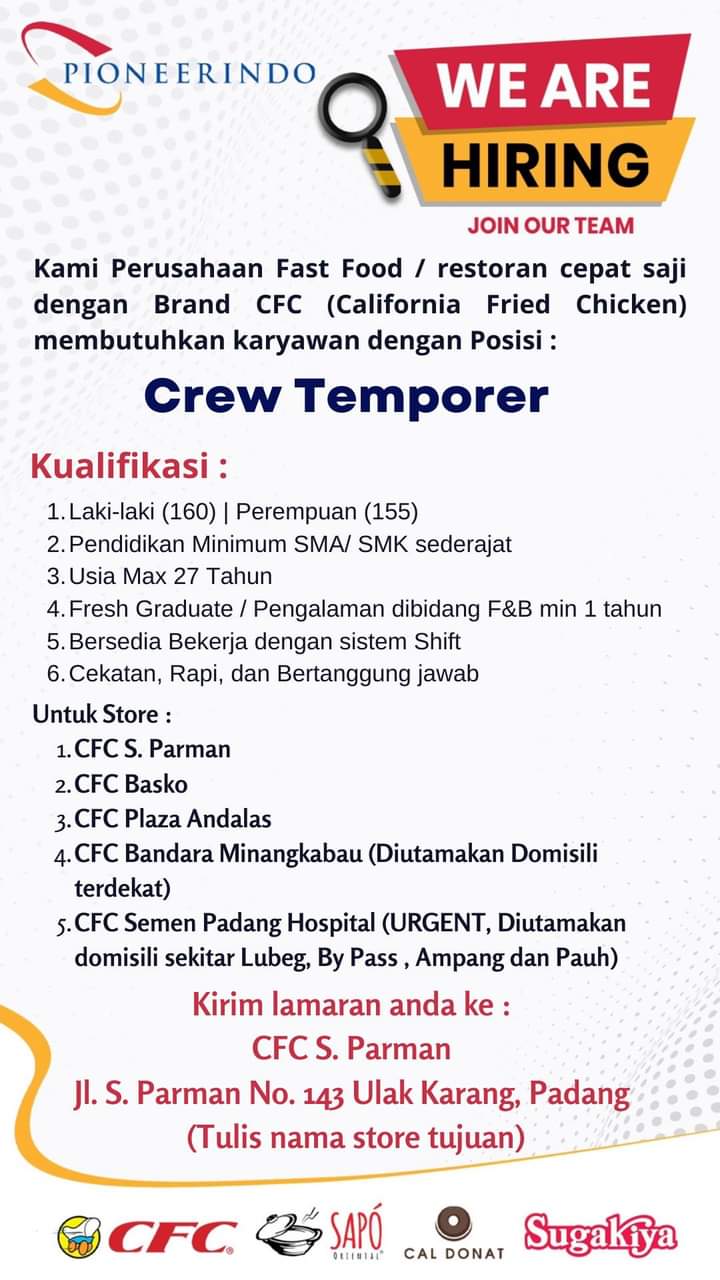 Padang, posinfo.co – California Fried Chicken (CFC) Padang saat ini membutuhkan beberapa orang karyawan baru untuk posisi Crew Temporer.
