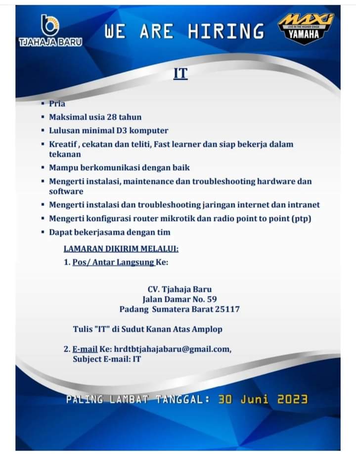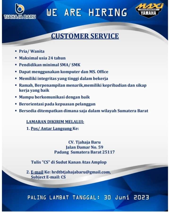 Padang, posinfo.co – CV Tjahaja Baru butuh karyawan untuk posisi Customer Service (CS) dan IT. Bagi anda orangnya silakan siapkan lamarannya.