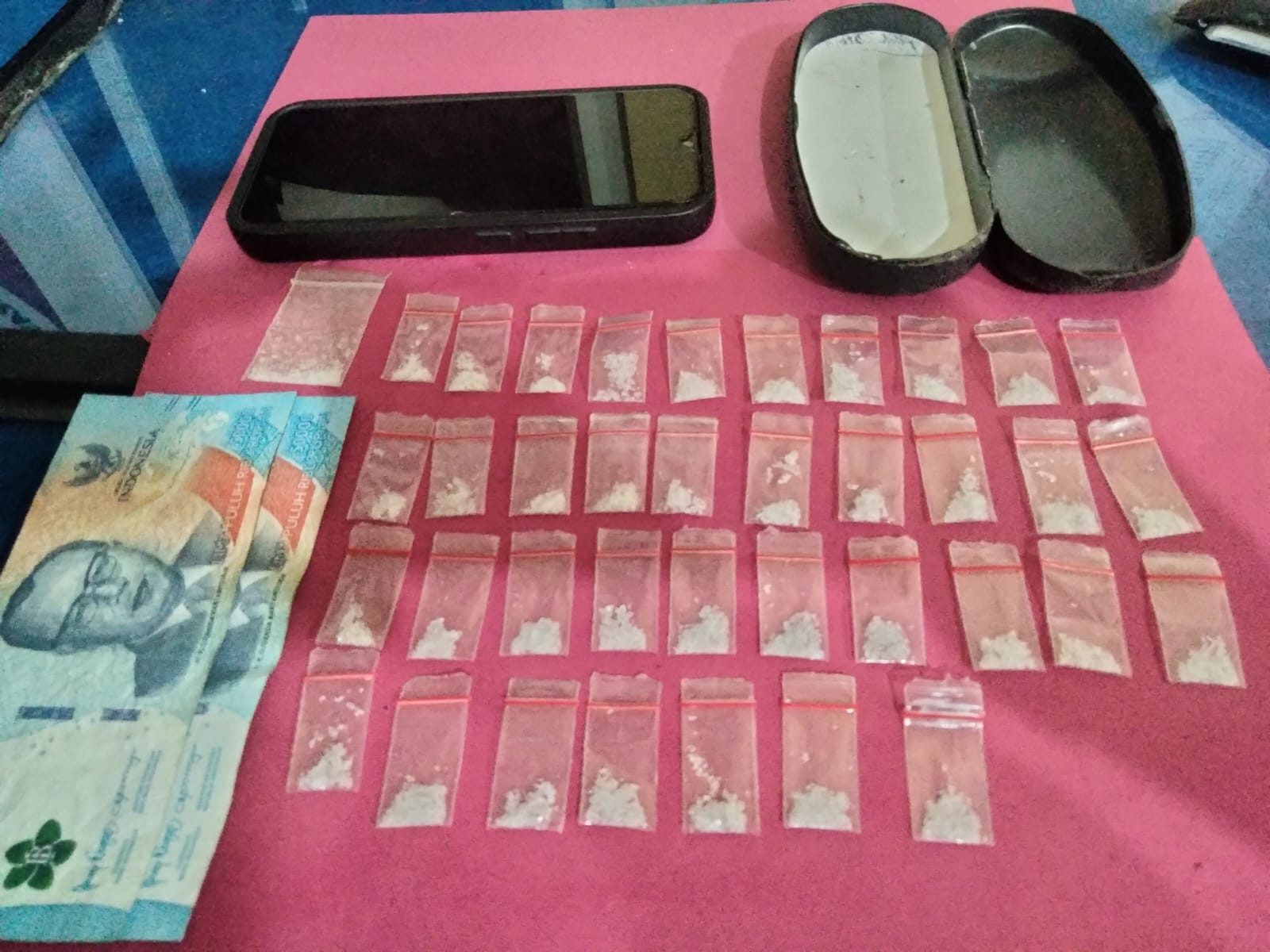 “Saat di tangkap, polisi menemukan satu kotak kacamata warna hitam yang berisi 38 paket kecil plastik berisi kristal putih yang diduga shabu.”