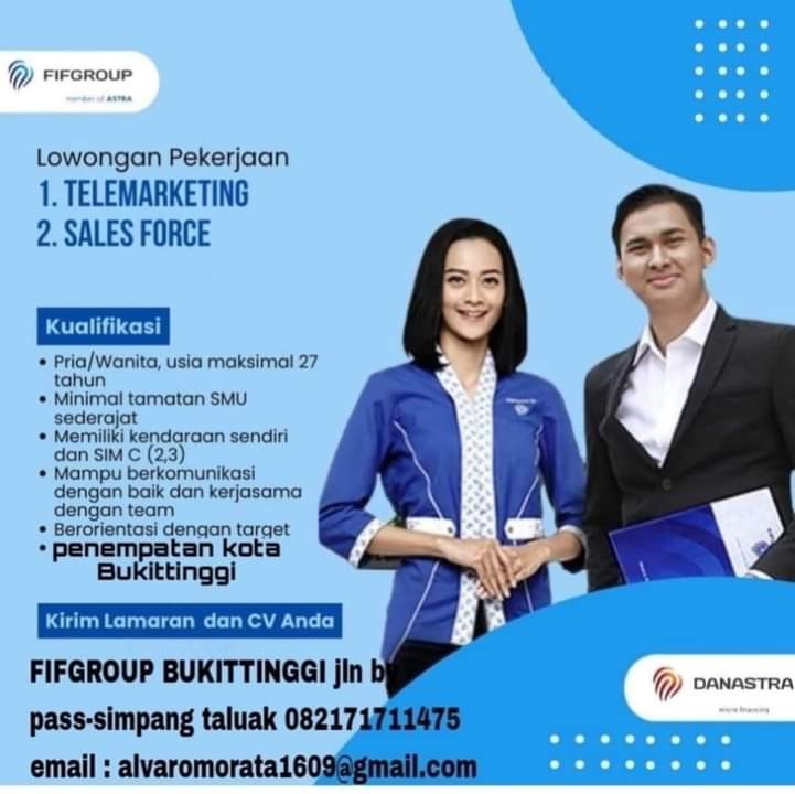 Jika anda orangnya, silakan kirim lamaran ke FIF Grup Bukittinggi, Jalan Bypass Simpang Taluak. Contak person 02171711475.