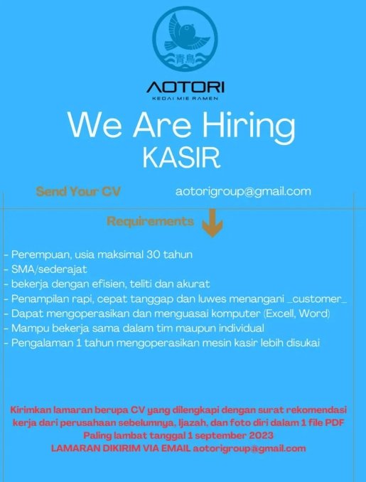 Saat ini Aotori Kedai Mie Ramen grup yang beroperasi di Kota Padang membutuhkan Tenaga Kasir.