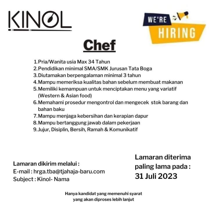 Padang, posinfo.co – Salah satu bistro favorit di Kota Padang, Kinol Bistro saat ini tengah membuka lowongan untuk mengisi posisi Chef.