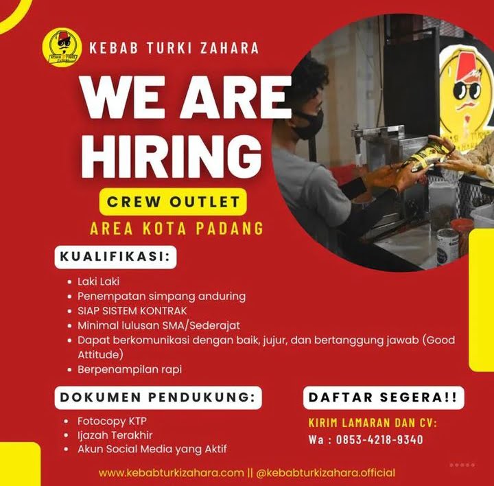 Selain itu, Kebab Turki Zahara juga sedang membutuhkan karyawan untuk posisi Crew Outlet untuk penempatan di Kota Padang.