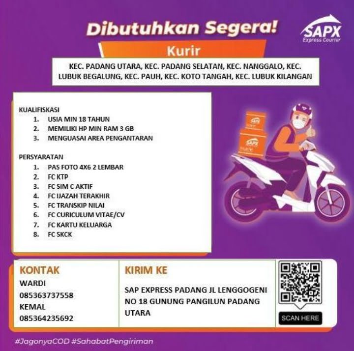 Saat ini SAPX sedang mencari calon karyawan untuk posisi kurir yang nantinya bertugas di beberapa kecamatan di Kota Padang.