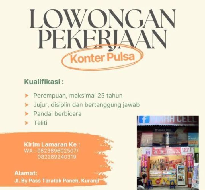 Padang, posinfo.co – Bagi yang berminat bekerja di counter HP, saat ini salah satu Counter HP di kawasan Bypass, Taratak Paneh, Kuranji sedang membutuhkan karyawan Counter Pulsa.