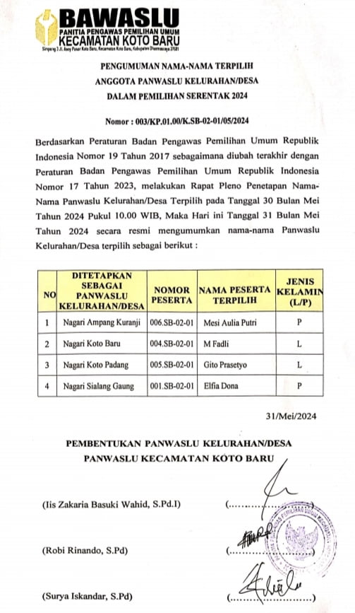 Dharmasraya, posinfo.co – Setelah menggelar seleksi Anggota Panitia Pengawas Pemilihan Umum (Panwaslu) beberapa waktu lalu, berikut Pengumuman Nama Anggota Panwaslu Kelurahan/Desa Kecamatan Koto Baru, Kabupaten Dharmasraya yang di nyatakan lulus.