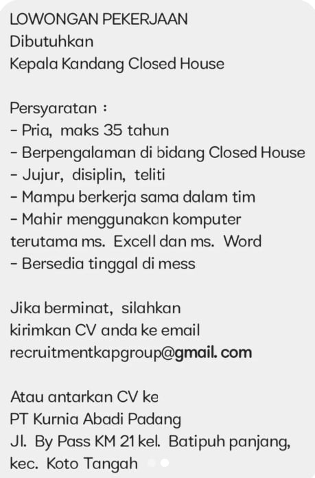 Padang, posinfo.co – Kali ini ada lowongan bekerja di sebuah perusahaan. Bagi yang masih mencari pekerjaan, saat ini PT Kurnia Abadi Kota Padang sedang mencari tenaga kerja untuk posisi Kepala Kandang.