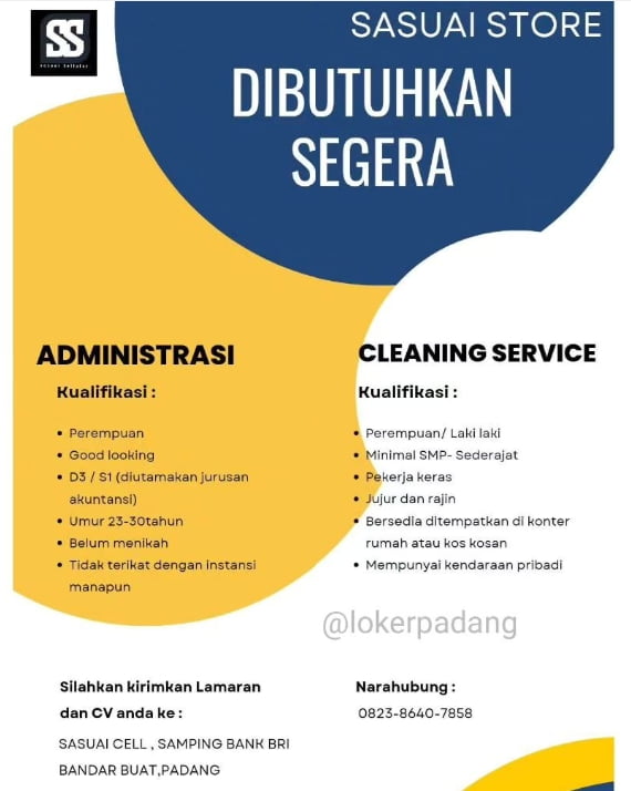 Bagi anda yang tertarik dengan lowongan pekerjaan ini, silakan segera mengirimkan lamaran ke Sasuai Cell, Samping Bank BRI Bandar Buat Padang.